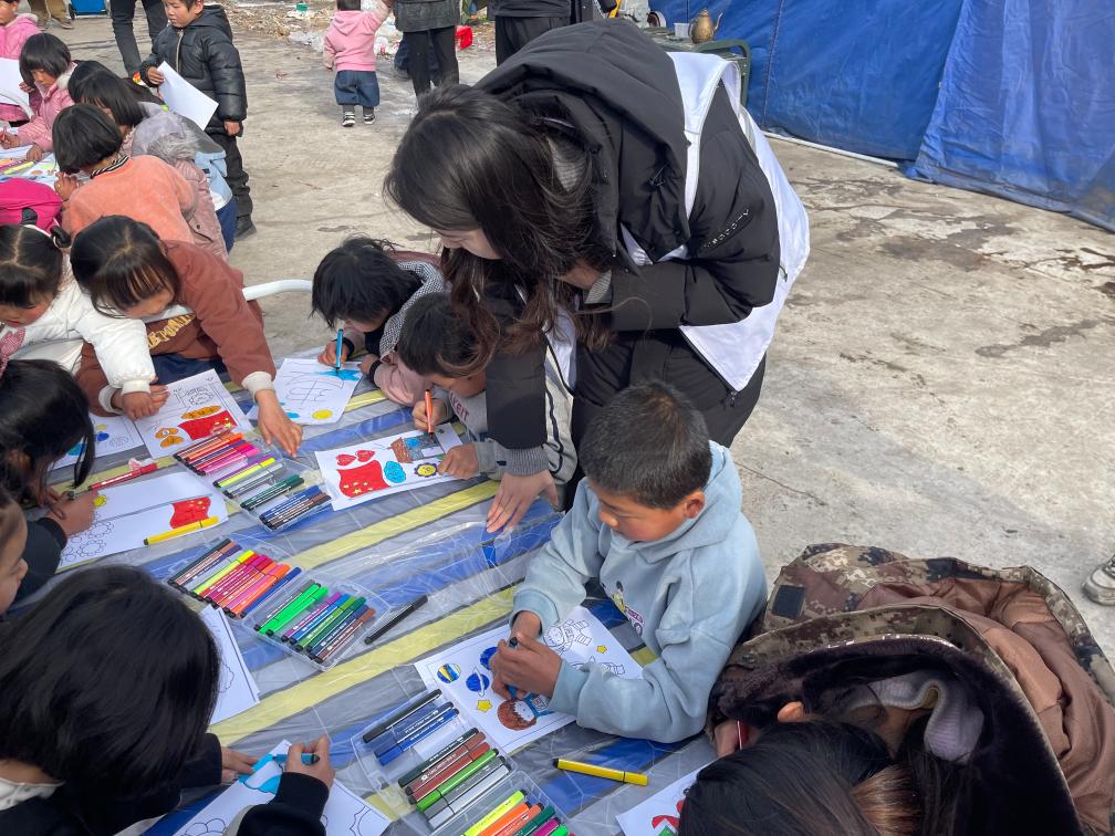 21日上午,冯小霞和24名同伴就从与积石山县毗邻的广河县抵达灾区,开展志愿服务。地震发生后,和冯小霞类似,来自多地的志愿者化身“帐篷城”里的“孩子王”,为大家开设了绘画、文化课程辅导、防灾救灾知识等内容的志愿服务。