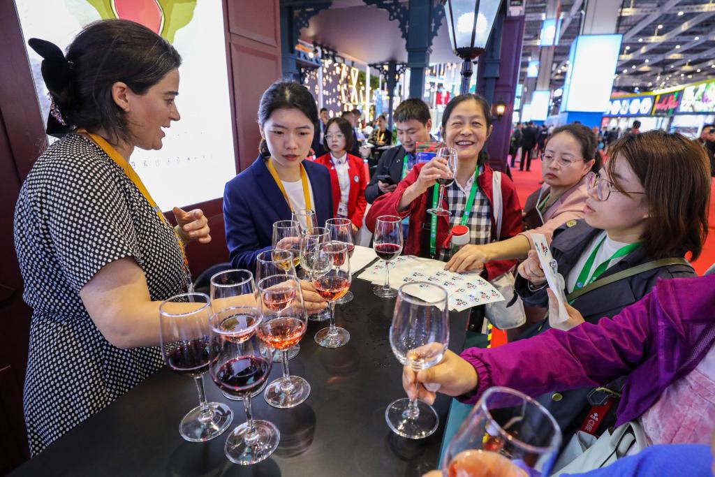 11月6日,参观者在第六届进博会国家展格鲁吉亚展台品尝格鲁吉亚红酒。新华社记者 辛梦晨摄