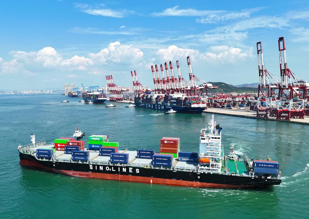 一艘货轮缓缓驶离山东港口青岛港(无人机照片,2023年8月30日摄)。新华社发(张进刚 摄)