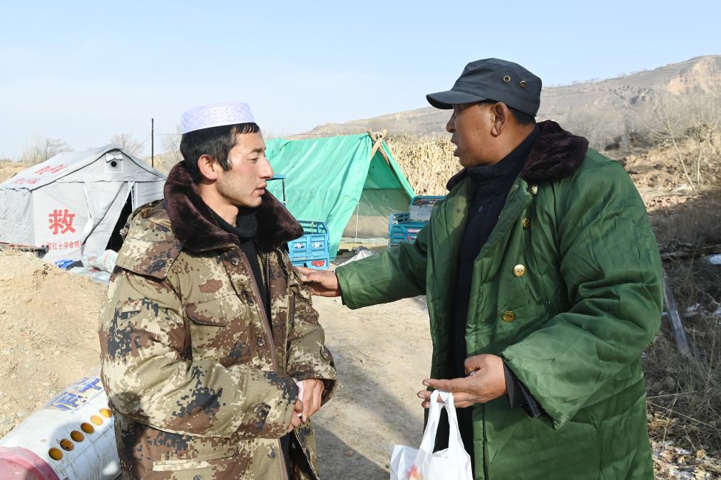 12月22日,在积石山县大河家镇克新民村,党支部书记张辉林(右)和村民商议安置事宜。新华社记者 范培珅 摄
