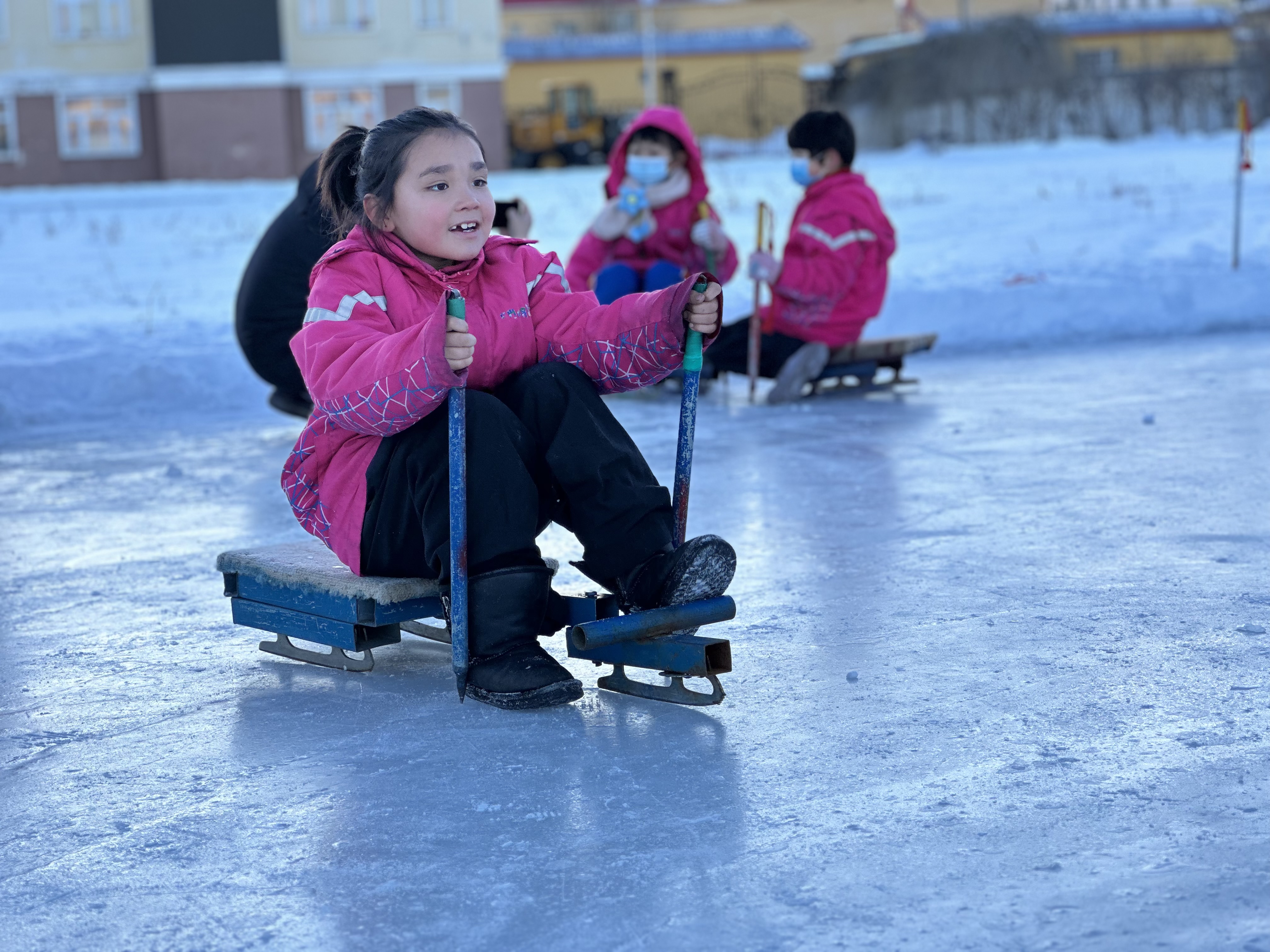“明年我就可以像他们一样穿上冰鞋自由滑行了。”冰道一旁的嬉戏区,一年级学生马一琳正在和同学玩冰爬犁,看着不远处正在练习速度滑冰和打冰球的高年级学生,眼里满是羡慕。
