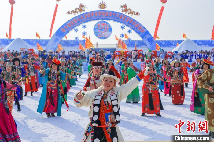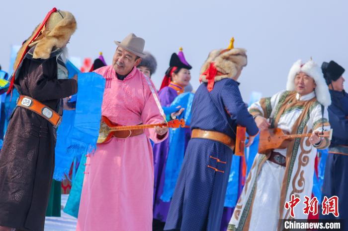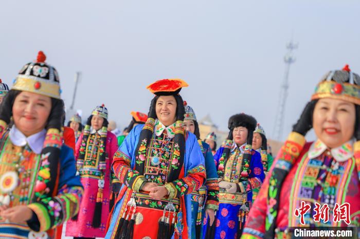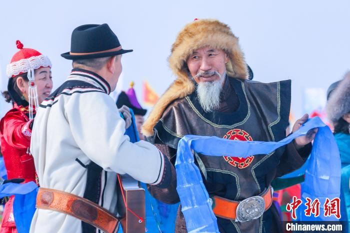 13日,第十届全国大众冰雪季暨博湖县第十六届冰雪季精彩开幕,十多位身着蒙古族传统服饰,手持洁白哈达的民众欢迎八方来客。杨辈兰 摄