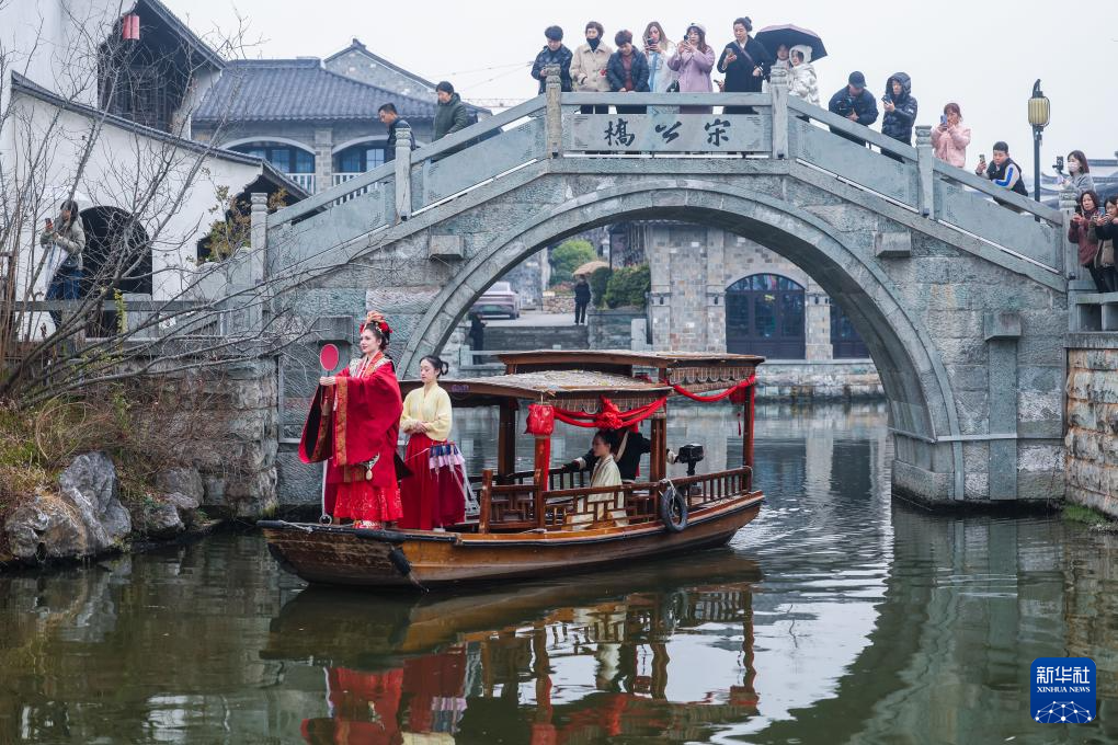 1月18日,中外青年身着传统服饰在建德严州古城的船上体验传统水上婚礼习俗。(图源:新华社)