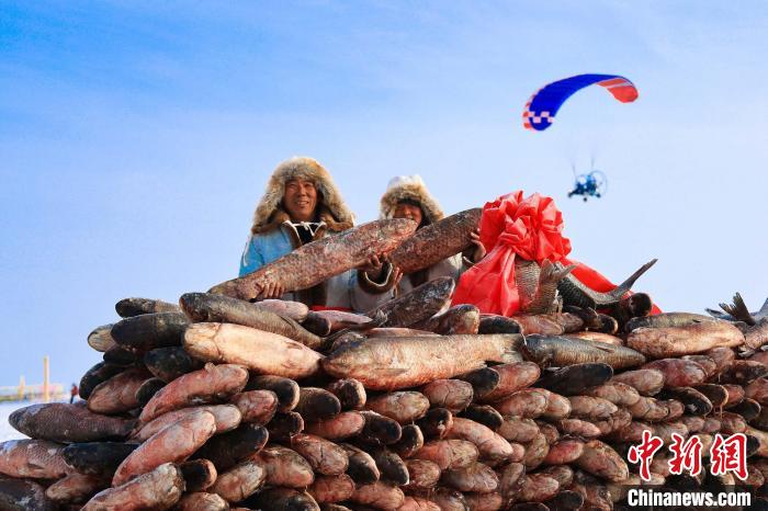 头鱼拍卖是每年冬捕的重头戏,渔民们将象征着吉祥的“头鱼”挂上展示台进行竞拍。拍得头鱼的马晓嘉激动地说:“头鱼代表着幸运、丰收和喜悦,拍得头鱼就是想抢一个好彩头,为2024年开个好头,望新的一年,也能红红火火、年年有‘鱼’。”