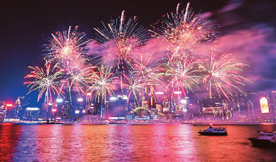 2023年10月1日,烟花在香港维多利亚港上空绽放。
