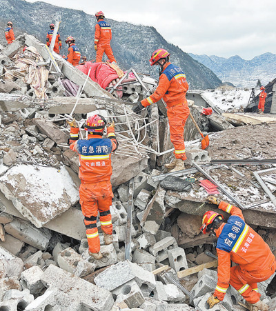 1月22日,救援人员在云南昭通市镇雄县凉水村进行搜救。