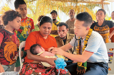 在巴布亚新几内亚中央省村庄里,第十二批援巴新中国医疗队副队长、新生儿科副主任医师刘振球为当地婴儿听诊检查。