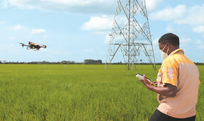 在乌干达卡隆古区卢卡亚镇中亿农业园,作业员赫伯特·阿加巴操控植保无人机喷洒农药。