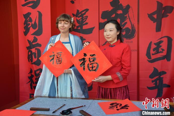 2月5日,在三亚举办的新春游园会上,俄罗斯友人身穿汉服体验中国书法,学写“福”字。张月和 摄