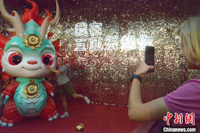 2月5日,在三亚举办的新春游园会上,外国友人与含有“龙”元素的雕塑合影。张月和 摄