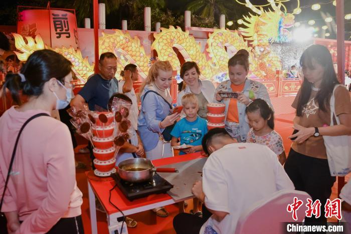 2月5日,在三亚举行的新春游园会上,外国友人围观画糖画。三亚市旅游发展局 供图