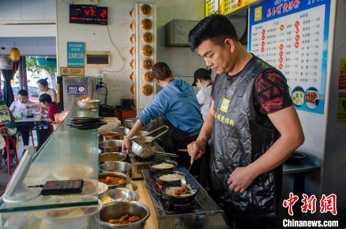 “70后”越南归侨吴玉明在侨港风情街经营一家煲仔粉店铺,传承疍家风味,是侨港镇热门“打卡点”之一。