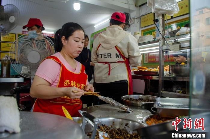 徐国芬的母亲是越南归侨,她从小学便跟着母亲学做越南卷粉,在菜市场摆摊售卖。如今40岁出头的徐国芬已是制作越南美食的行家里手,经营多家越南卷粉店。