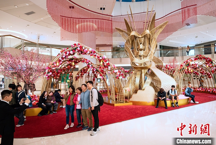 2月18日,市民游客在香港西九龙文化区一家商场的龙年装饰前观赏拍照。 中新社记者 侯宇 摄