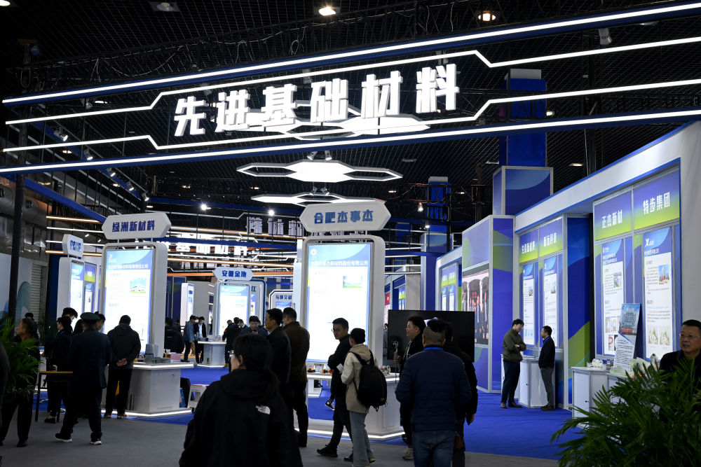 在安徽省蚌埠市举办的第三届国际新材料产业大会展览上,观众在先进基础材料展区参观(2023年11月24日摄)。新华社记者 黄博涵 摄
