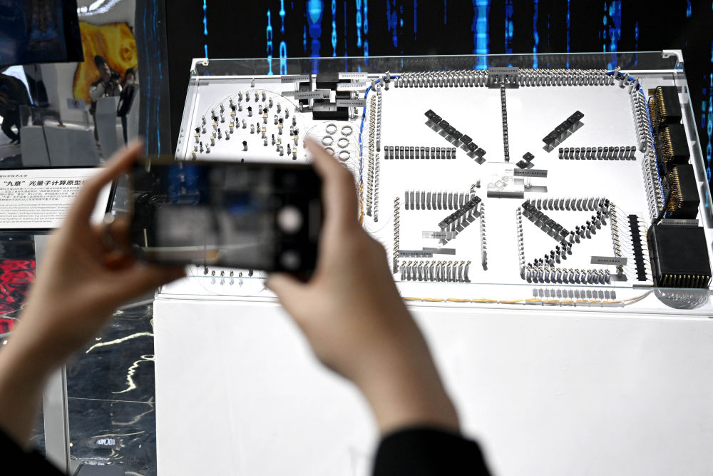 观众在第二届中国(安徽)科技创新成果转化交易会上拍摄“九章”光量子计算原型机模型(2023年4月26日摄)。新华社记者 黄博涵 摄