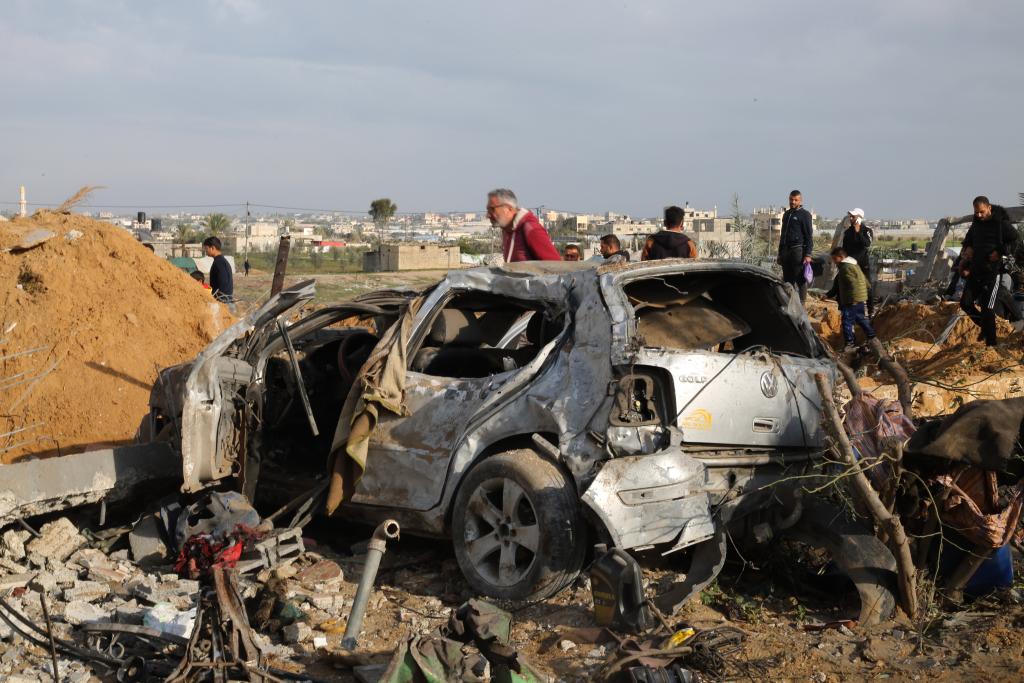 2月21日,在加沙地带南部城市拉法,巴勒斯坦人查看以军空袭后的废墟。新华社发(哈立德·奥马尔摄)