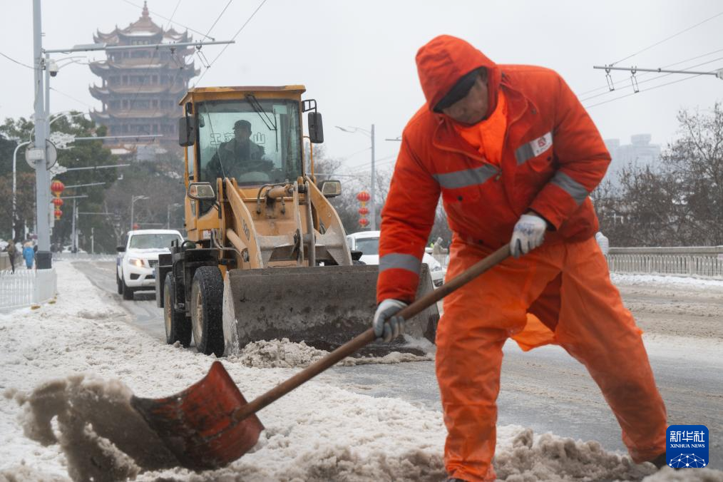 2月22日,中建三局总承包公司建设者在武汉市武昌区东一路附近扫雪。新华社发(谢杰夫摄)