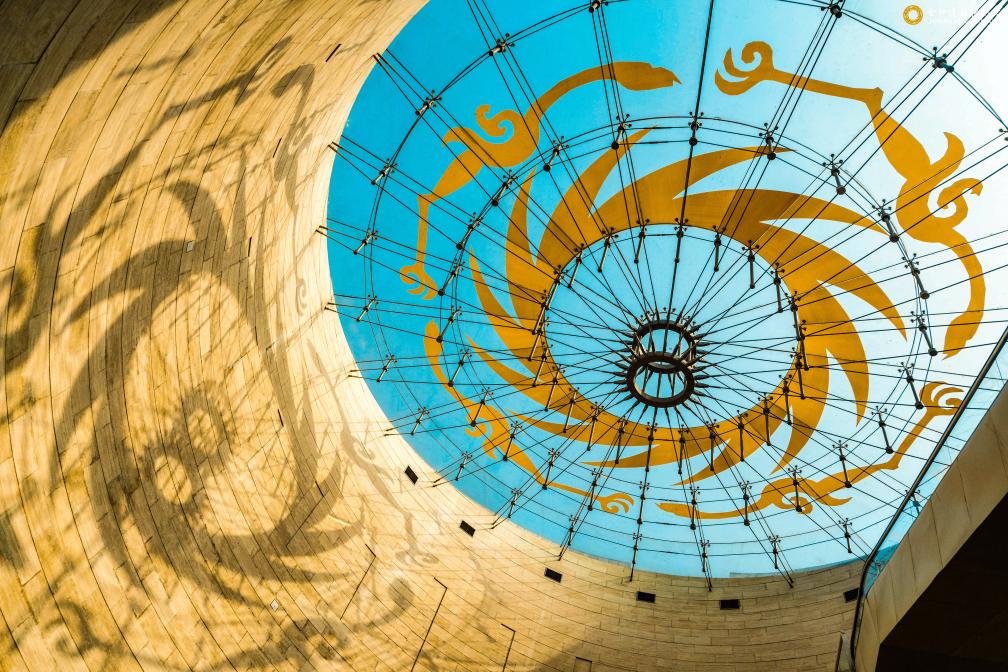 这是阳光透过成都金沙遗址博物馆陈列馆穹顶,在墙壁上投下太阳神鸟造型的影子(2022年3月10日摄)。新华社发(张艳摄)