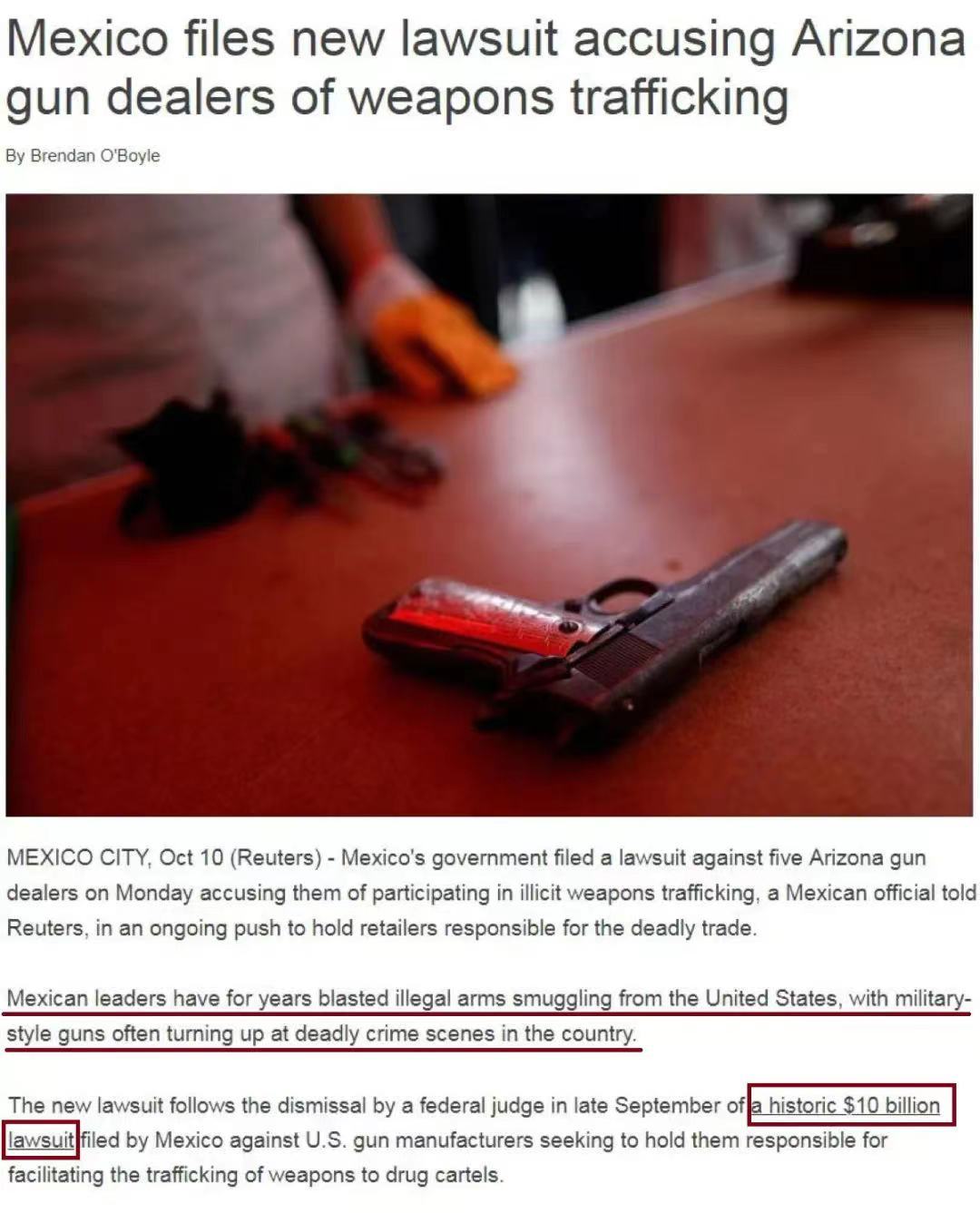 早在2021年8月,墨西哥政府就曾起诉11家美国枪支制造商,要求它们对大量枪支非法流入墨西哥、助长墨国内暴力事件频发负责,并且向它们索赔100亿美元。
