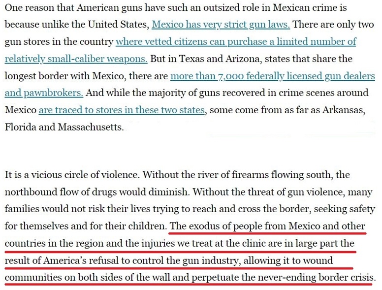 文章认为,正是美国枪支制造商和经销商不负责任地输出枪支,助长了墨西哥的暴力犯罪活动,才迫使许多家庭背井离乡。