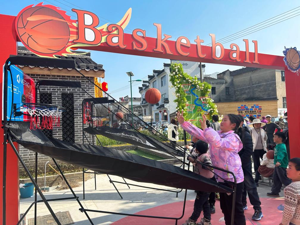 10岁的西溪南镇居民潘华琳正在体验投篮。新华社记者 周畅 摄