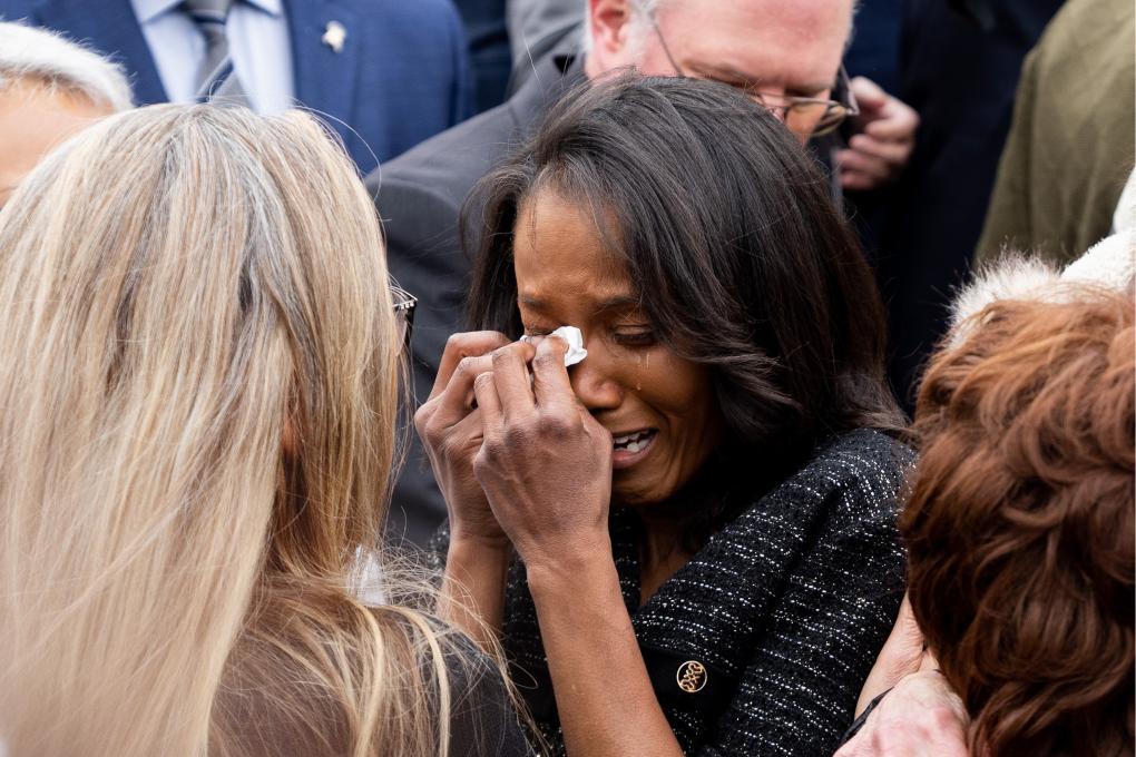2023年1月6日,在美国首都华盛顿的国会大厦外,一名前国会警察遗孀在纪念“国会山骚乱”两周年纪念仪式上流泪。新华社记者 刘杰 摄