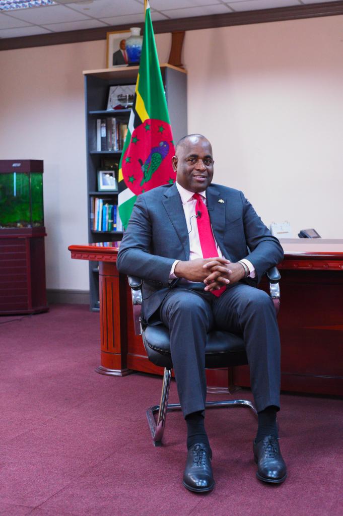 3月4日,多米尼克总理斯凯里特在首都罗索的总理办公室接受新华社记者独家专访。新华社记者 赵凯 摄