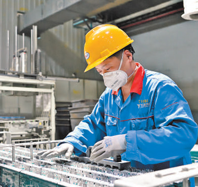 天能电池集团(安徽)有限公司电池装配车间内,工人正在检验极耳。