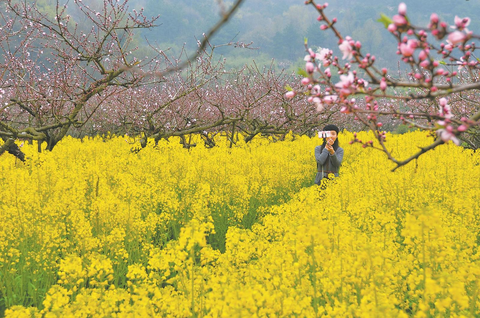 大山村桃花与油菜花同时绽放,游客在花海里“打卡”。本报通讯员 潘峰 摄