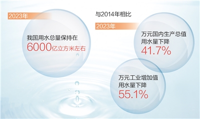 本报北京3月24日电(记者王浩)记者近日从水利部获悉:水利部门全面贯彻落实“节水优先、空间均衡、系统治理、两手发力”治水思路,推动用水方式向节约集约转变。初步统计显示,2023年我国用水总量保持在6000亿立方米左右。这意味着,2014年以来,我国国内生产总值增长近一倍的情况下,用水总量总体稳定在6100亿立方米以内;与2014年相比,2023年万元国内生产总值用水量、万元工业增加值用水量分别下降41.7%、55.1%。全国用水“账单”里的变与不变,反映了用水效率和效益持续提升,印证了发展质量和效益不断提高。