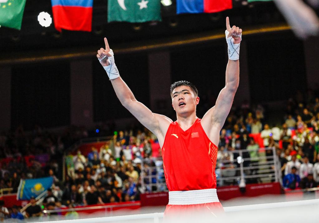 在杭州亚运会拳击项目男子80公斤级决赛中,中国选手托合塔尔别克·唐拉提汗夺冠。 新华社记者 颜麟蕴 摄