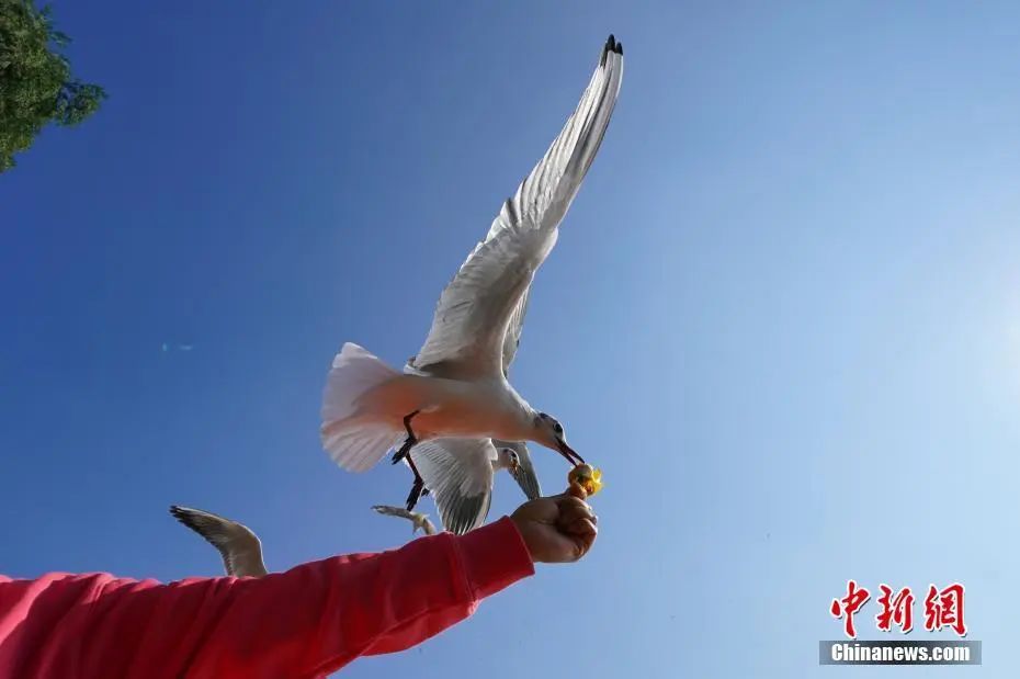 图为红嘴鸥从游客手中取食。中新社记者 刘冉阳 摄