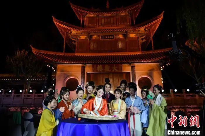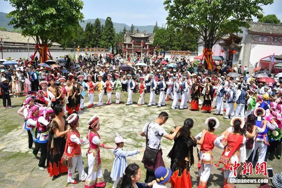 图为游客在云南民族村内载歌载舞。中新社记者 刘冉阳 摄