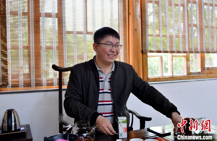 图为3月27日,魏文在福州市连江县贵安温泉会议中心的办公室与客人交谈。 中新社记者 吕明 摄
