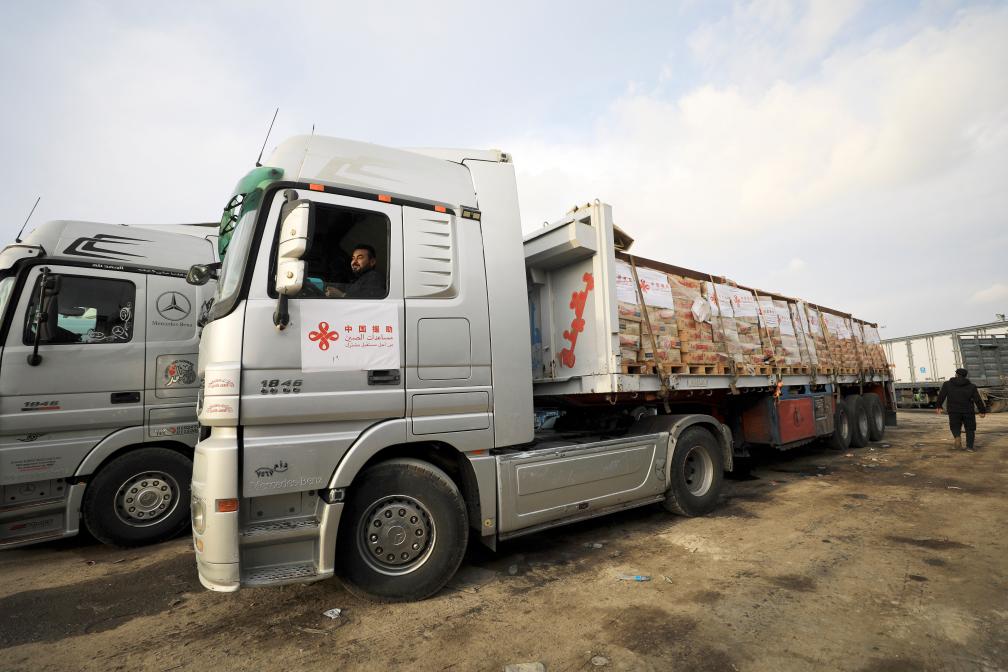 2023年12月17日,载有中国援助的人道主义物资的货车抵达凯雷姆沙洛姆口岸加沙地带一侧。新华社发(亚西尔·库迪摄)