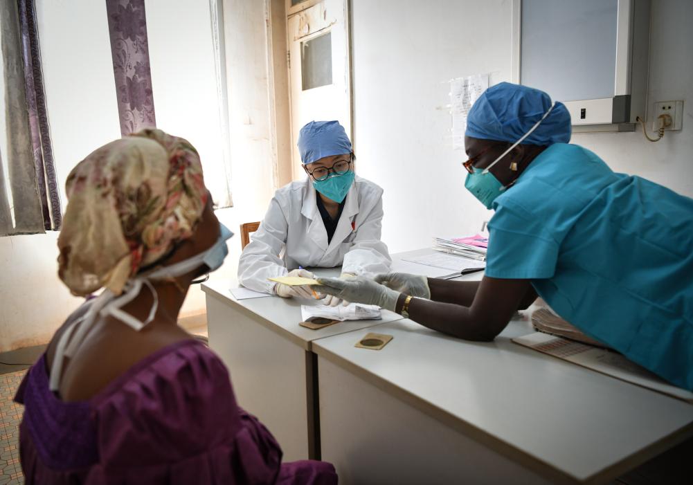 2024年2月5日,在中非共和国首都班吉,援中非中国医疗队妇产科医生梁丹(中)与助手(右)在班吉友谊医院为患者诊疗。新华社记者韩旭摄