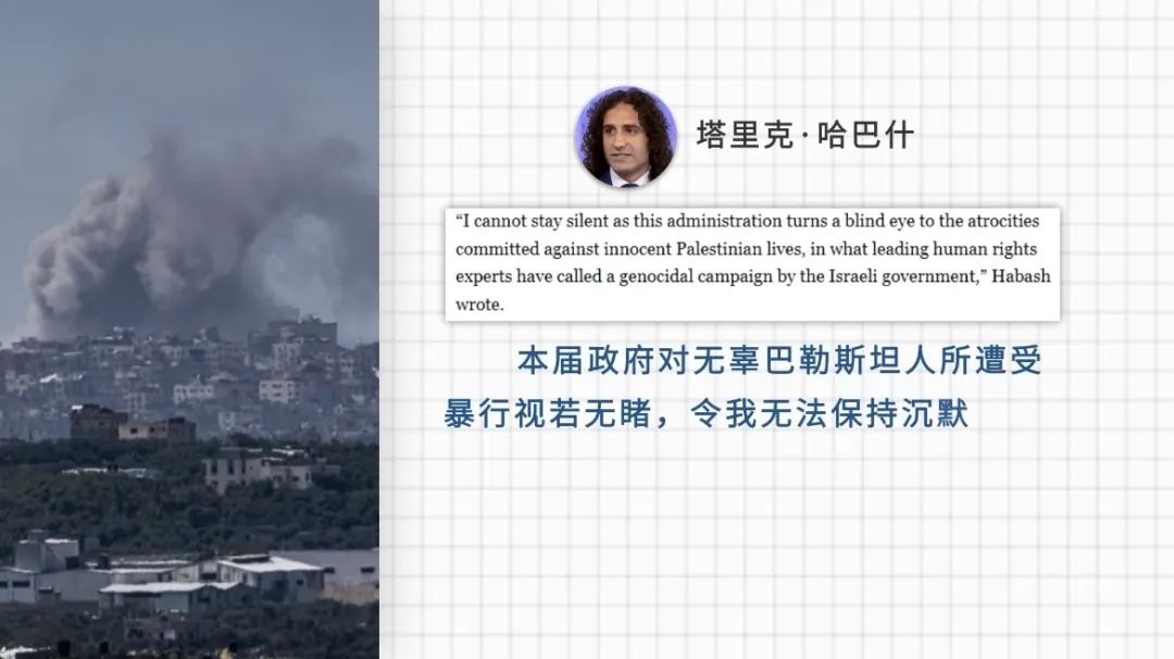 就在哈巴什宣布辞职的同一天,拜登竞选连任团队17名工作人员匿名发表一封公开信,敦促拜登呼吁加沙地带停火止战。去年11月,美国国务院国际开发署上千名员工发表一封联名公开信,敦促美国政府呼吁加沙地带立即停火。去年10月,美国国务院资深官员乔希·保罗宣布辞职,抗议美国政府对以色列的“盲目支持”。