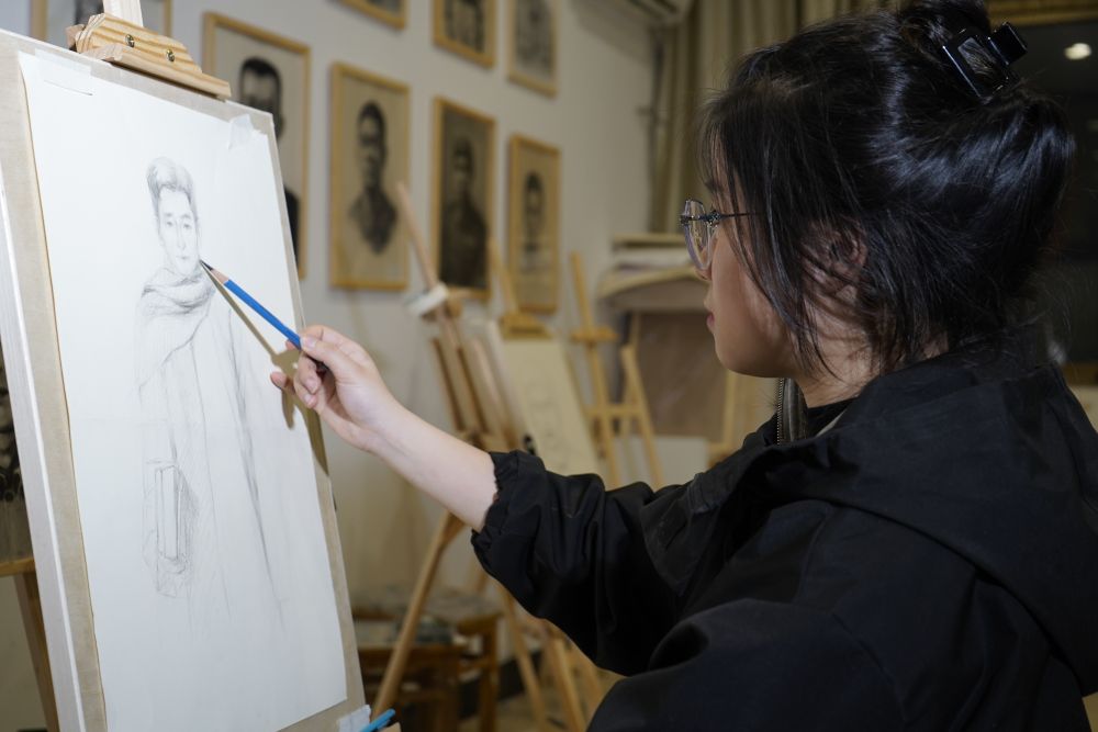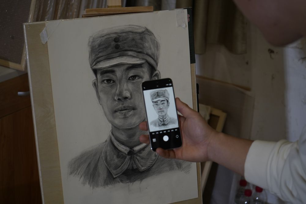 4月3日,安徽师范大学的“00后”大学生马苗苗在根据烈士亲人的要求修改和打磨画像。新华社记者 周畅 摄