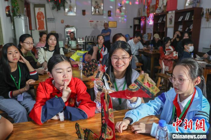 图为“同祖同根·萍城有爱”香港青年内地交流团成员和萍乡市本地学生一起在观察皮影戏使用的道具。刘力鑫摄