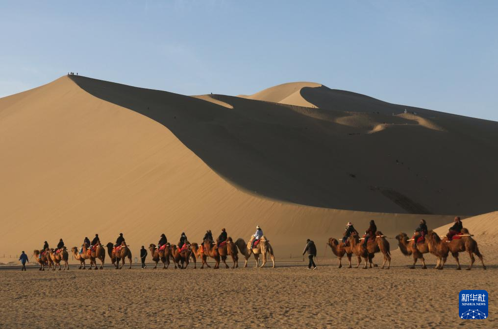 4月5日,游客在甘肃省敦煌市鸣沙山月牙泉景区游览。新华社发(张晓亮 摄)