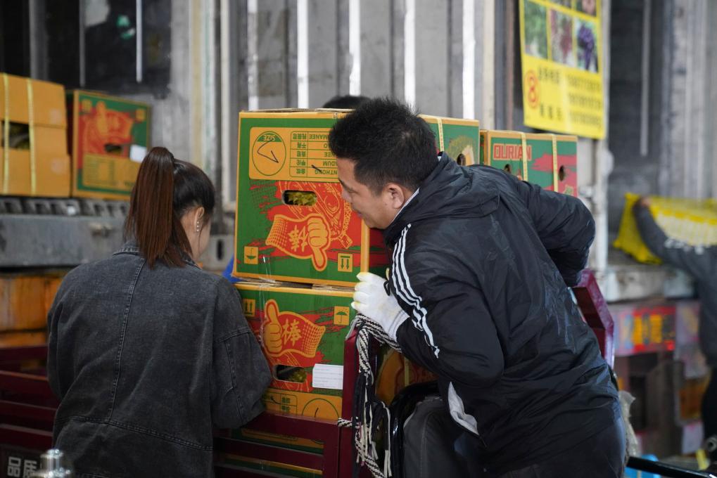 商贩在广西南宁海吉星水果批发市场运输榴莲(2023年4月25日摄)。新华社记者 赵欢 摄