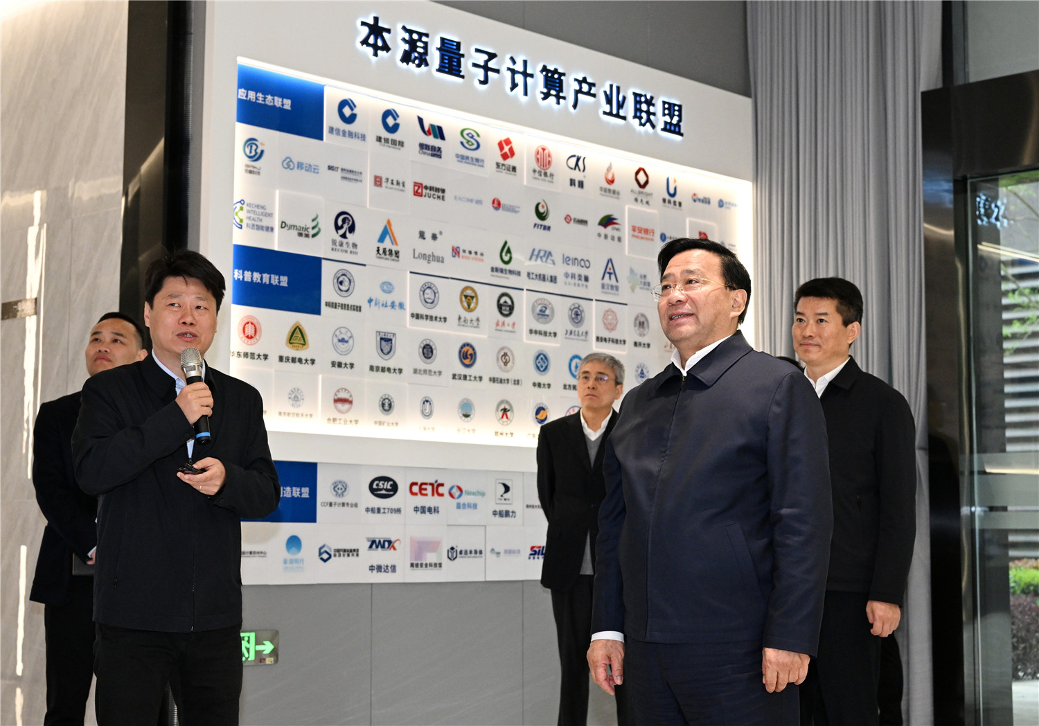 本源量子计算科技(合肥)股份有限公司是我国首家量子计算企业,发明专利数量位居全球前列、国内领先。韩俊详细了解公司科技创新、技术攻关、产品应用等情况,实地察看量子计算芯片省重点实验室、量子计算机组装测试实验室和国产稀释制冷机生产组装车间,深入了解“本源悟空”超导量子计算机及核心部件研发情况。他指出,量子科技是新一轮科技革命和产业变革的前沿领域,是发展未来产业的重要抓手。我省是最早布局量子科技与产业的地区之一,“量子”已成为安徽一张重要的名片。要全方位服务保障国家战略科技力量,以更大力度统筹量子科技领域人才、基地和项目,加快推进量子科技重大项目实施,不断取得世界领先的原创性成果。要以科技创新推动产业创新,前瞻性布局量子产业,加速培育“量子+”产业集群,牢牢抢占科技和产业双制高点。