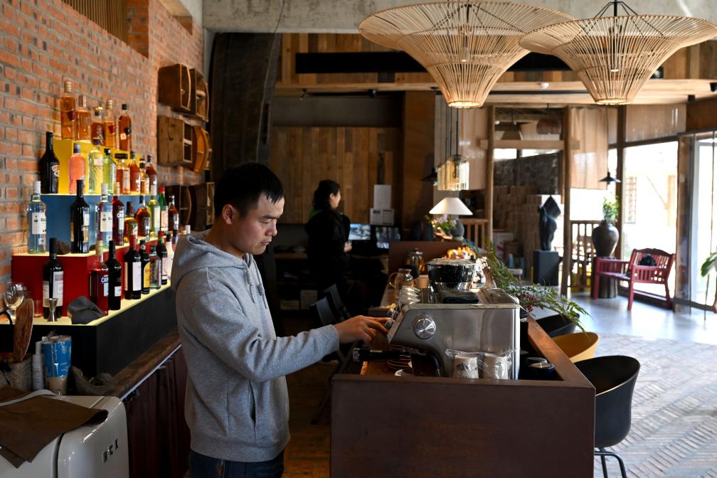 3月30日,温纪高(左)为游客冲调咖啡。新华社记者 黄博涵 摄