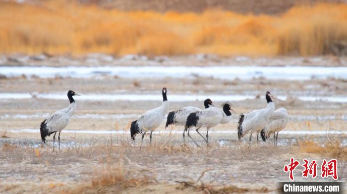 乌鲁木齐4月8日电 (巴特尔达拉 曹玥)连日来,位于新疆若羌县境内的阿尔金山国家级自然保护区依协克帕提湖湿地,迎来大批迁徙归来的黑颈鹤栖息觅食。