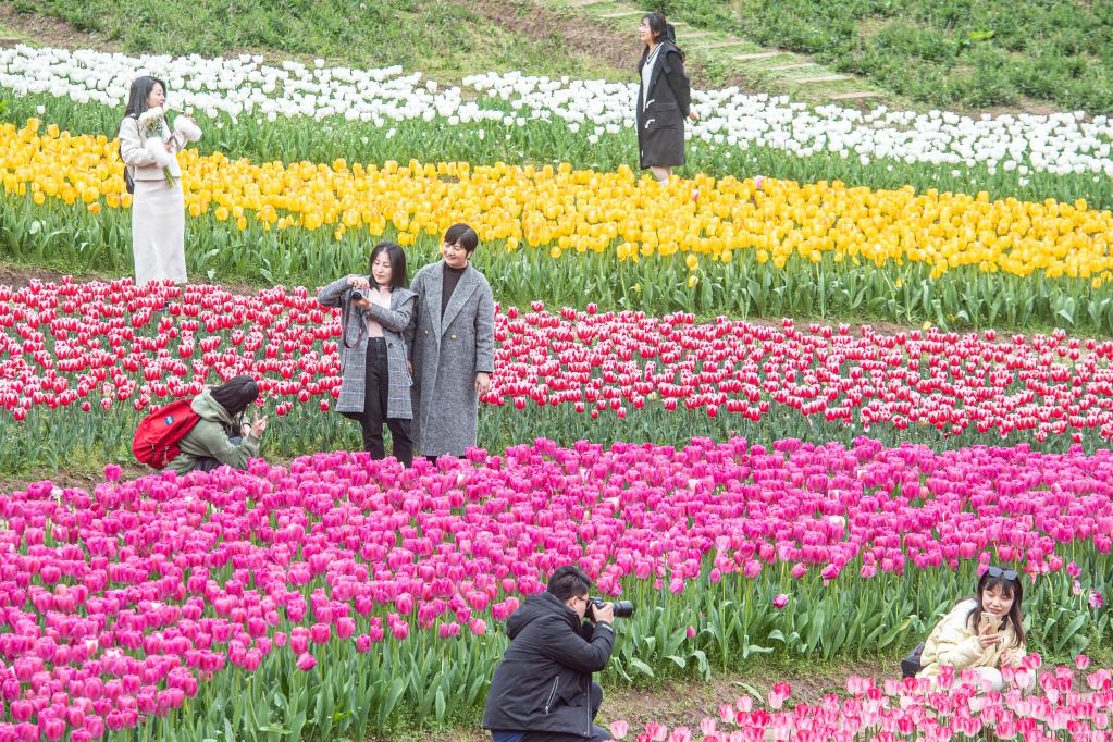 3月9日,在位于重庆市长寿区的长寿湖景区,游客在郁金香花海中赏花拍照。景区今年一共从荷兰进口郁金香种球近60万粒,分三大系列27个品种,种植面积约12000平米。新华社记者唐奕摄