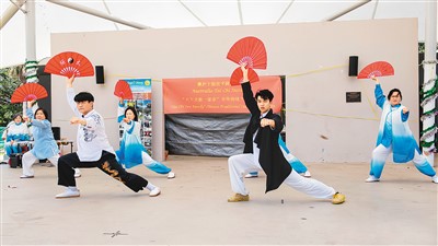 二〇二二年五月,钟维康(前排左一)在“天下太极一家亲”中华传统文化活动日上表演太极追风扇。