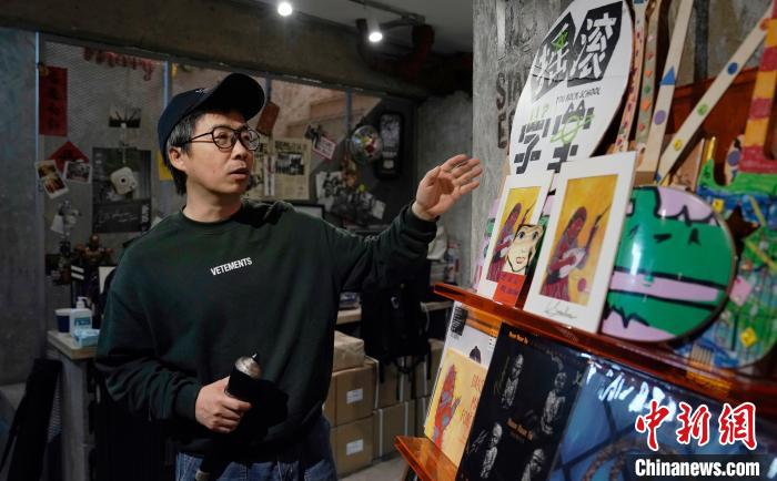 “战马时代”创始人、资深乐评人刘钊正在展示为维吾尔族歌唱家塞努拜尔制作的演出周边纪念品。景诗雁 摄