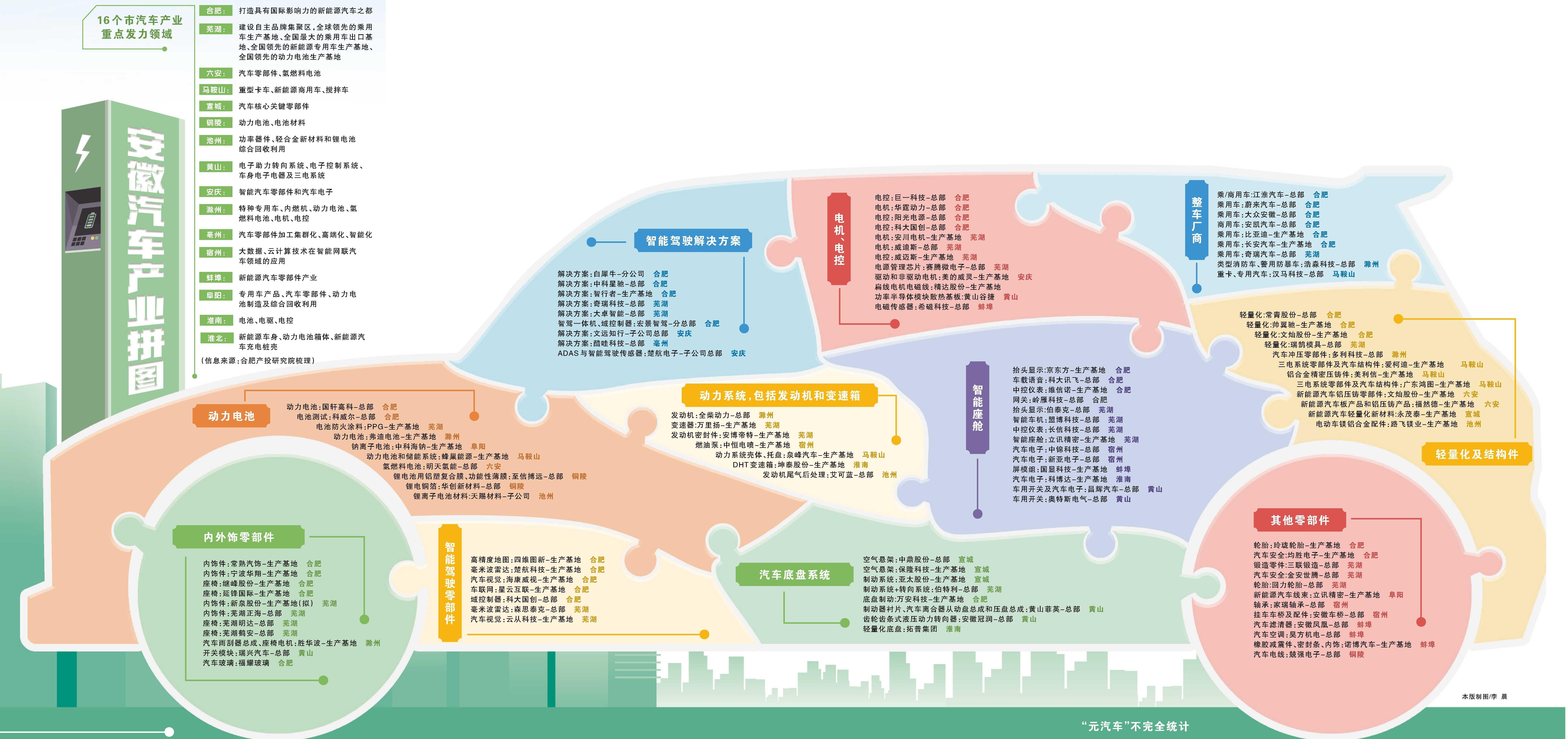 根据国元证券研究所等方面对16市部分代表性汽车及零部件企业的统计,当前,在皖落地的至少有22家代表性整车厂商及整车基地,27家电池厂商及基地,12家电机、电控厂商及基地,7家动力系统厂商及基地(包括发动机和变速箱),19家智能座舱厂商及基地,12家智能驾驶零部件厂商及基地,14家智能驾驶解决方案厂商及基地,9家内外饰零部件厂商及基地,18家轻量化及结构化厂商及基地,8家汽车底盘系统厂商及基地,18家其它零部件厂商及基地(包括轮胎、汽车安全、线束、空调、开关等)。