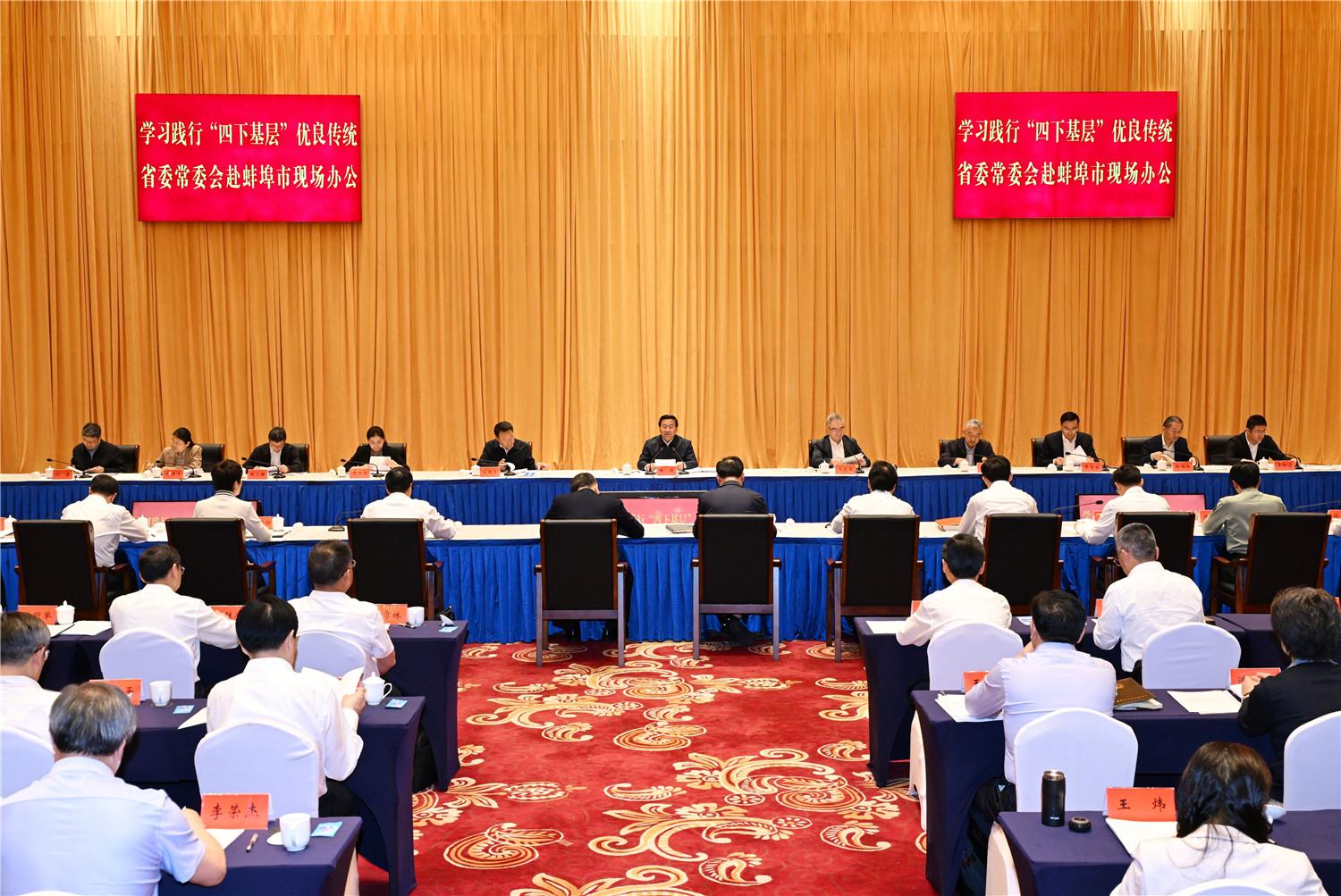 5月15日下午,省委常委会学习践行“四下基层”优良传统,赴蚌埠市现场办公。省委书记韩俊主持会议并讲话。他强调,蚌埠市要全面贯彻党中央决策部署和省委工作要求,完整准确全面贯彻新发展理念,抢抓长三角一体化发展这个最大机遇,增强只争朝夕、再创辉煌的历史使命感和紧迫感,树立“重返全省第一方阵”的雄心壮志,扬优势、锻长板、补短板、优环境、强产业、增实力,因地制宜发展新质生产力,在皖北全面振兴中勇当先锋,为打造“三地一区”、建设“七个强省”作出应有贡献。省委副书记、省长王清宪讲话。省委副书记、政法委书记虞爱华,省委常委,省政府有关负责同志出席会议。